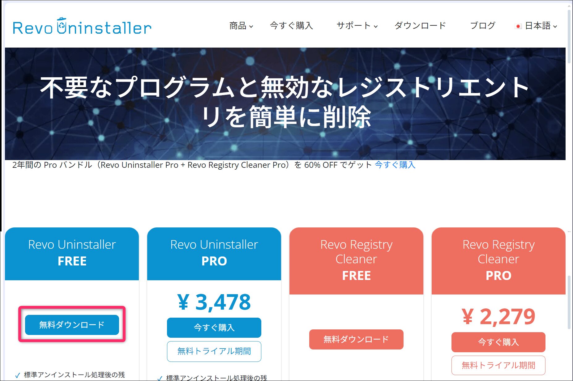まずこのソフトを Revo Uninstaller 公式サイト からダウンロードします。