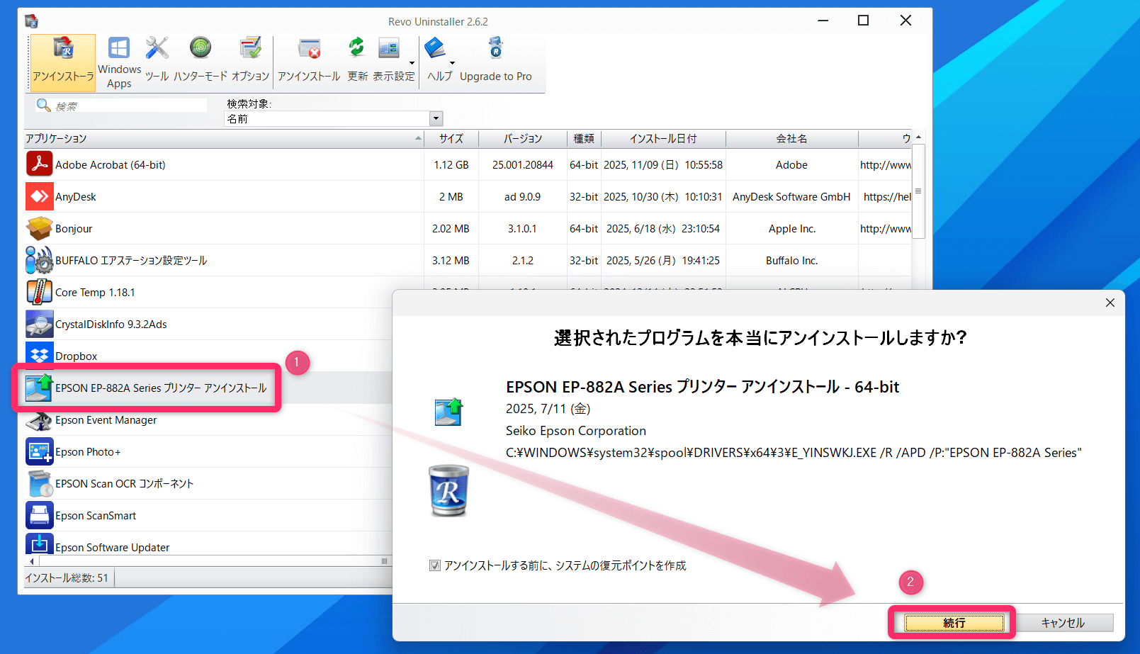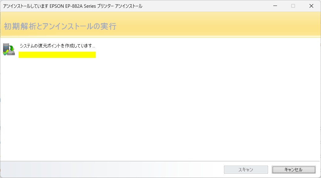 下の画面のように、自動でアンインストール前にシステムの復元ポイントを作成してくれます。
