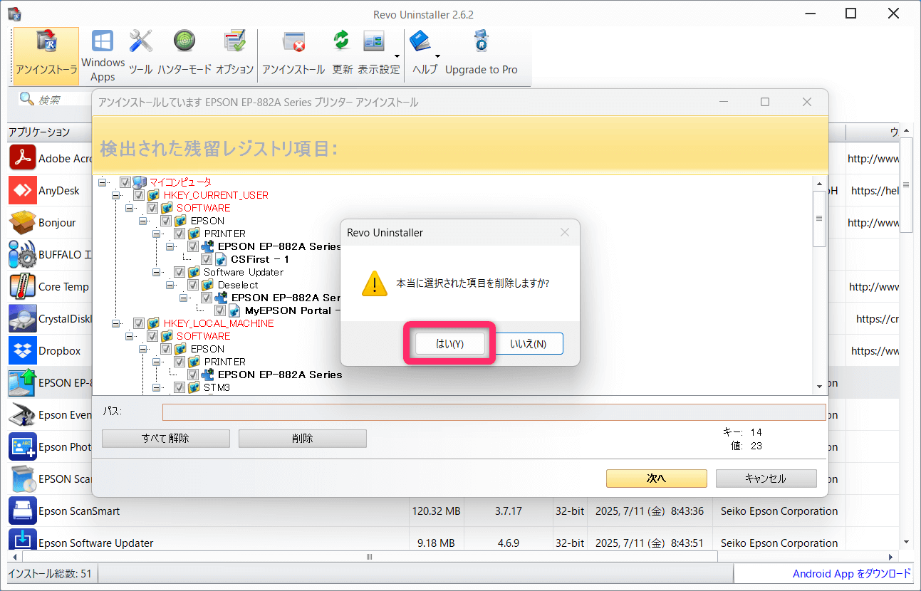 「本当に選択された項目を削除しますか?」に対して、問題なければ「はい」で進めます。
