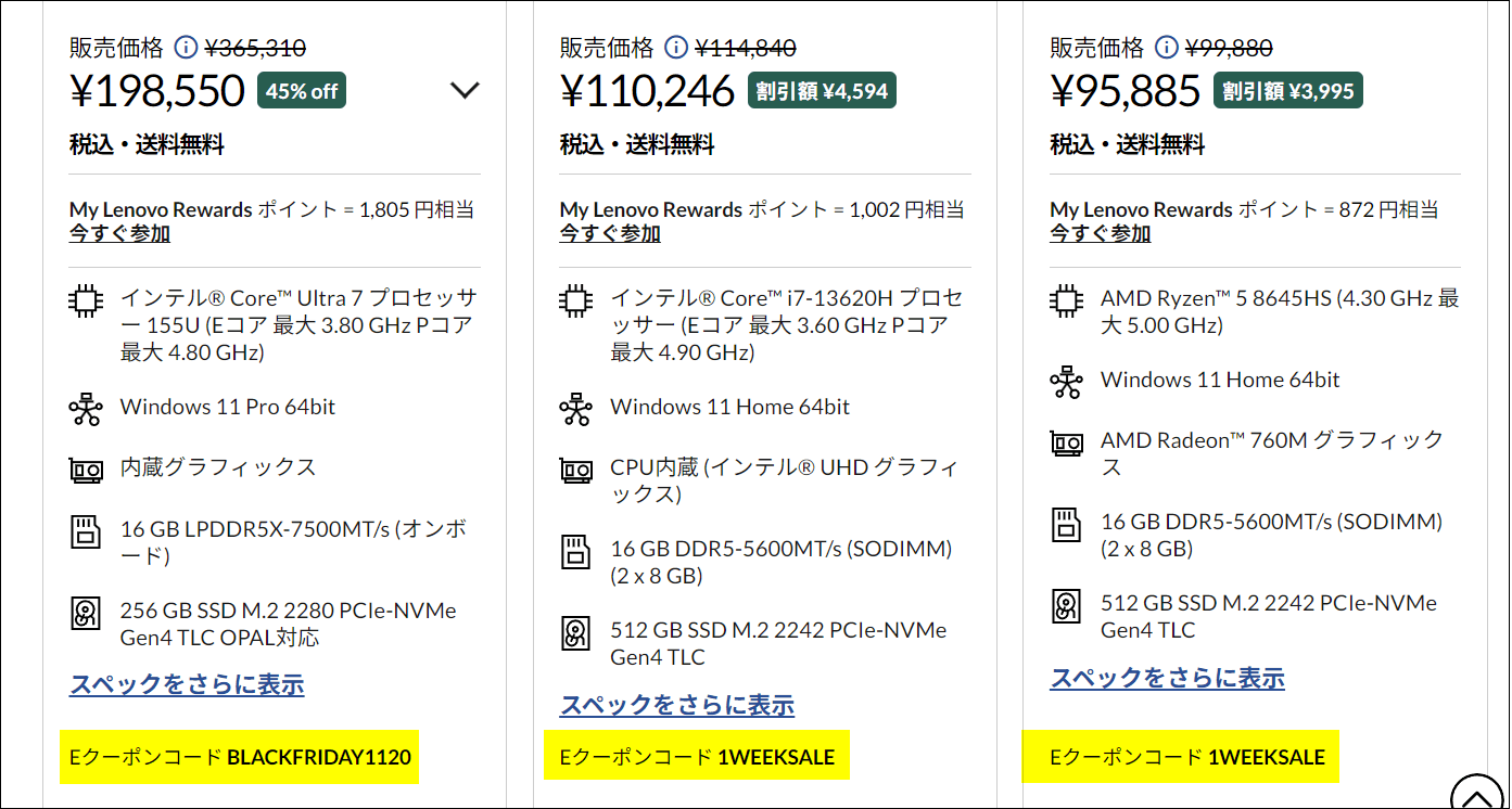 Lenovoでは多くのモデルに「Eクーポン」という会員向けの割引コードが設定されていて、それが適用されると通常価格から 10~45%ほどの追加割引 が入ります。