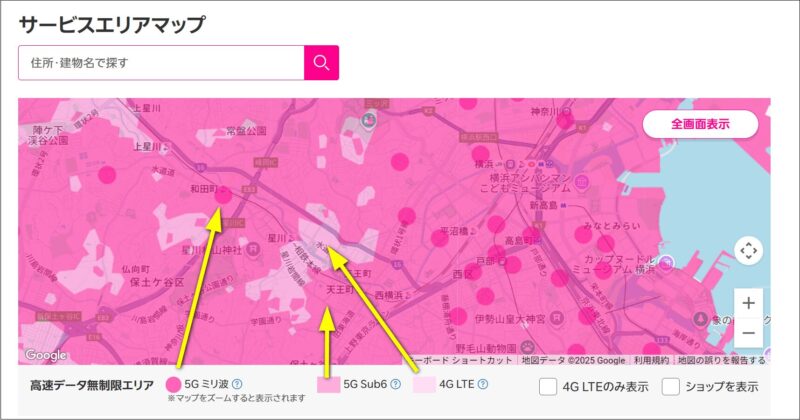 「4G LTE」「5G Sub6」「5G ミリ波」のどのエリアに入っているかを確認します。