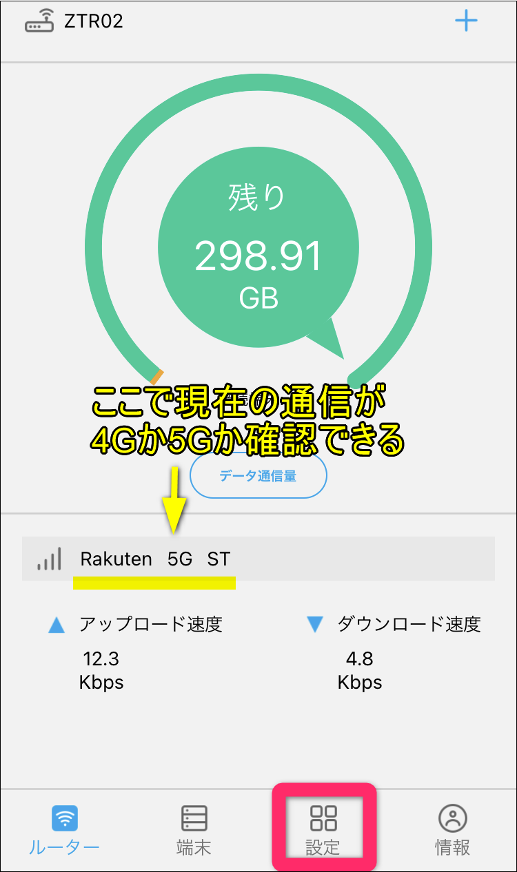 この画面でも現在の通信状態(4G か 5Gか)を確認できます。