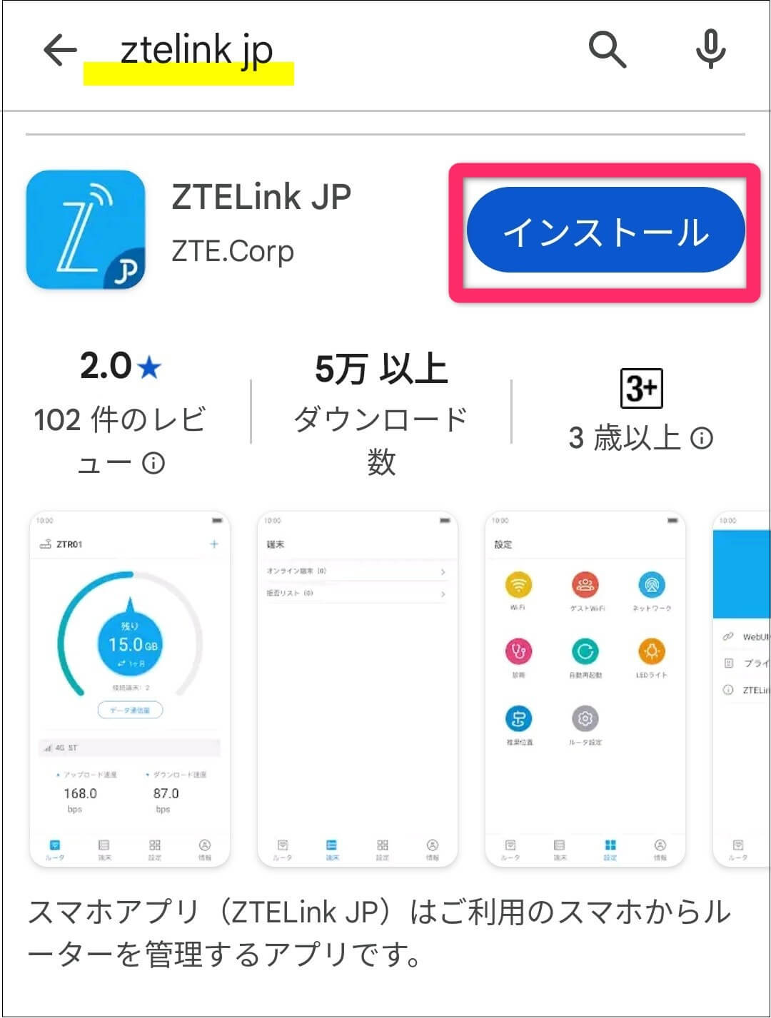 「ZTE Link jp」のアプリをまずインストールしましょう。