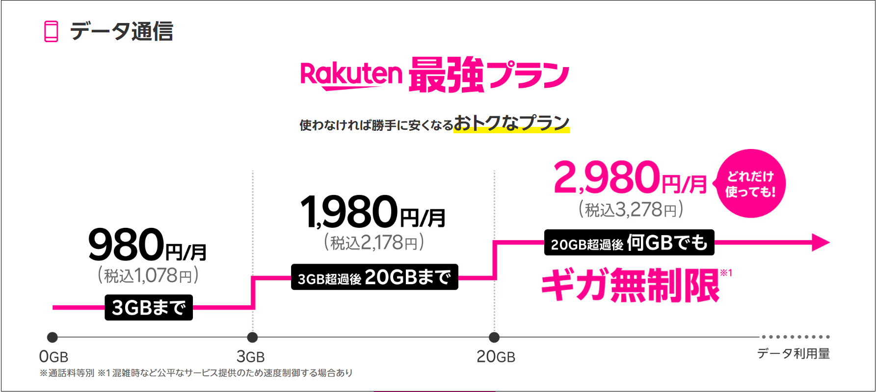 Rakuten最強プランは、使ったデータ量に応じて料金が変動するワンプラン制です。