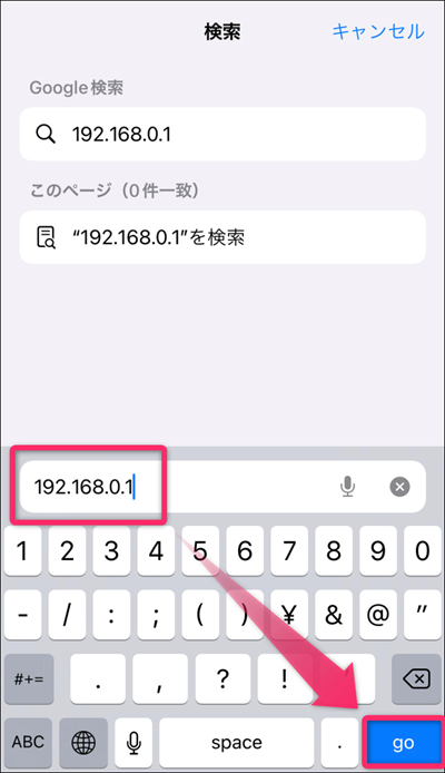 Wi-Fiに接続できたらWebブラウザ(Chrome、Safariなど)を開いて、アドレスバーに192.168.0.1と入力します。