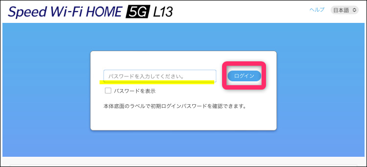 そうすると、L13 の管理画面に入るためのパスワードを入力する画面になります。