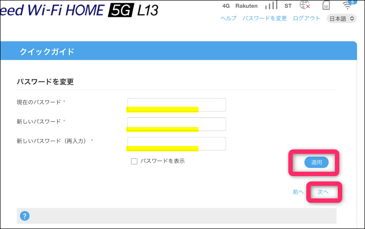 パスワード変更が求められたら、先ほどのパスワードと自分で作成したパスワードを入力して「適用」→「次へ」で進みます。
