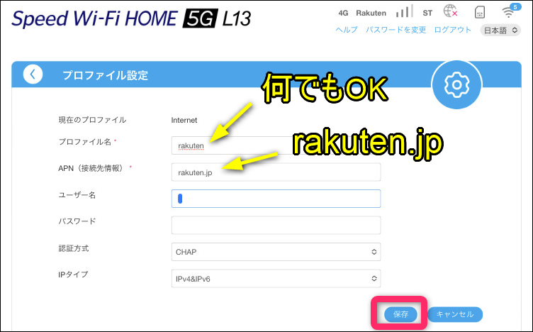APN(接続先情報)は rakuten.jp と入力し、保存 します。