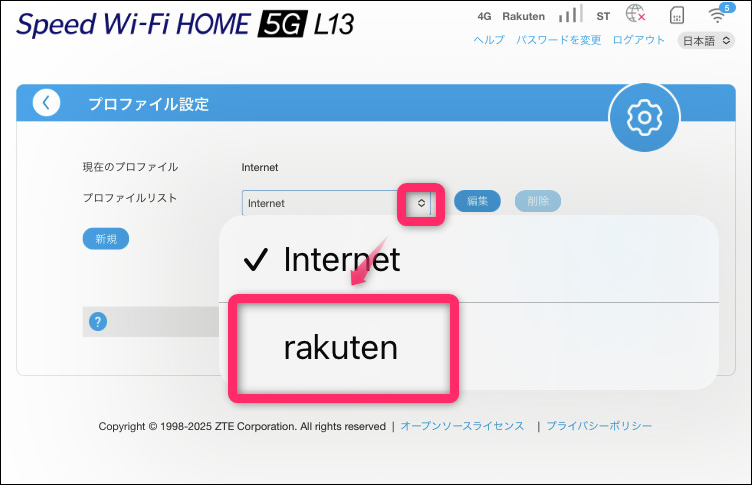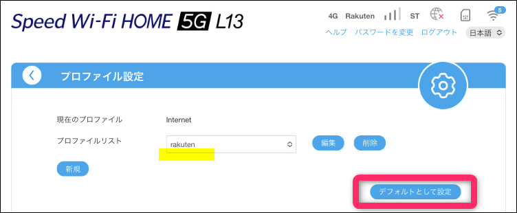 プロファイルリストがデフォルト(初期)では「Internet」となっていますが、先ほど自分で作ったプロファイル名に切り替えます。