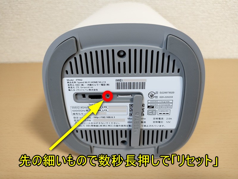 中古製品など以前使用していた人の設定が残っている可能性があるなら、下記のように先の細いもので底面のリセットボタンを数秒押します。