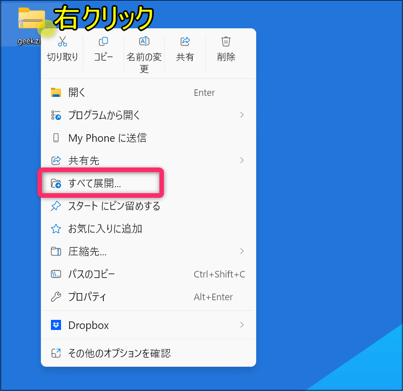 任意の場所にZIPファイルがダウンロードされたら、右クリックして「すべて展開」します。