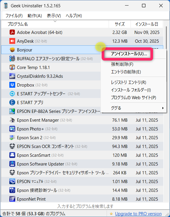 削除したいアプリをリストから見つけて、右クリックから「アンインストール」を選択します。