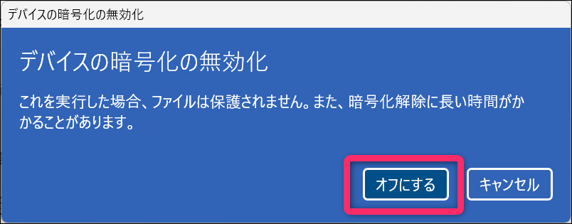 そうすると「デバイスの暗号化の無効化」とあるので「オフにする」ボタンを押します。