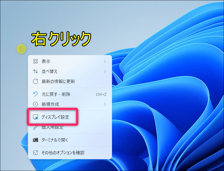 まず、ホーム画面のどこでも良いので右クリックし「ディスプレイ設定」を選択します。