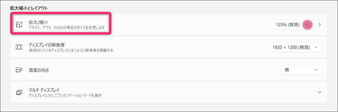 「拡大/縮小」の項目のところでお好みの拡大率(例:125%や150%)を選択します。