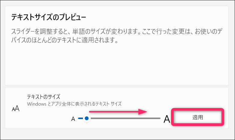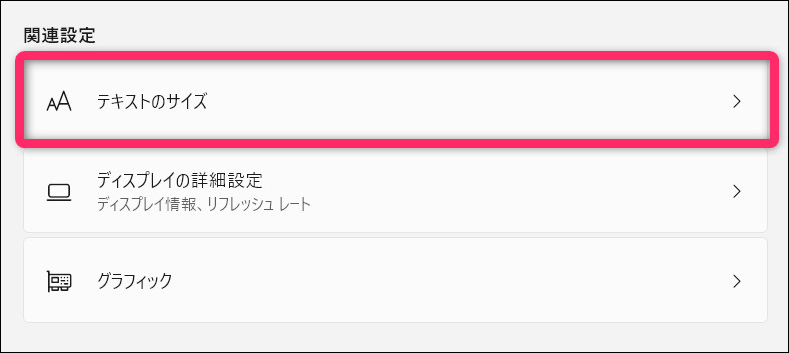 (左側のメニューから「アクセシビリティ」を選び、「テキストのサイズ」でも同じです)