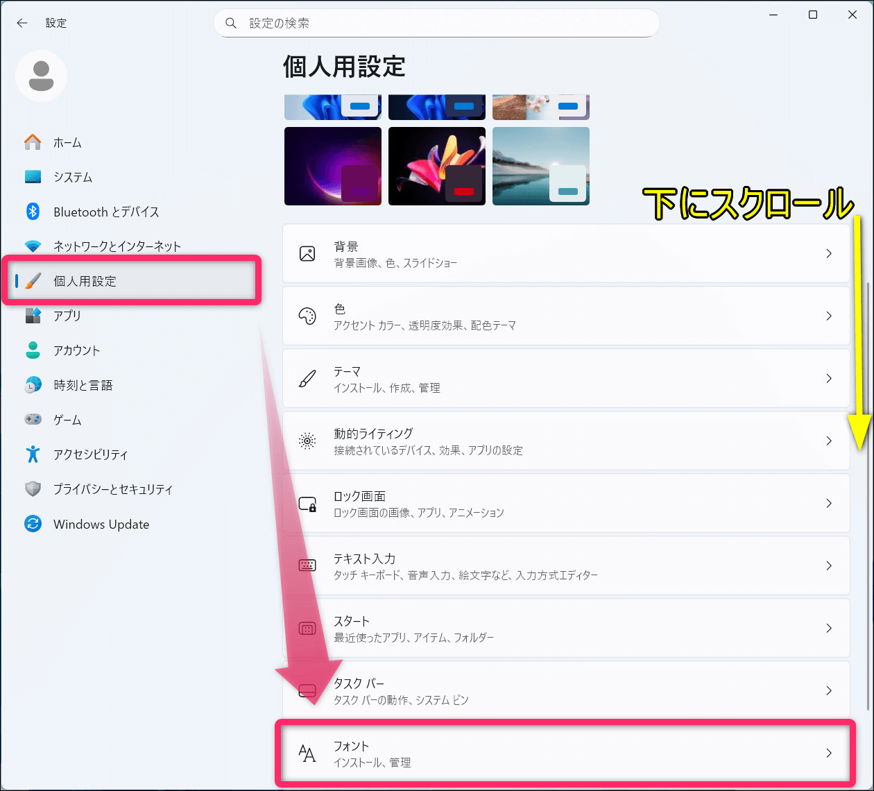 画面左メニューの「個人用設定」から、下の方にある「フォント」を選択します。