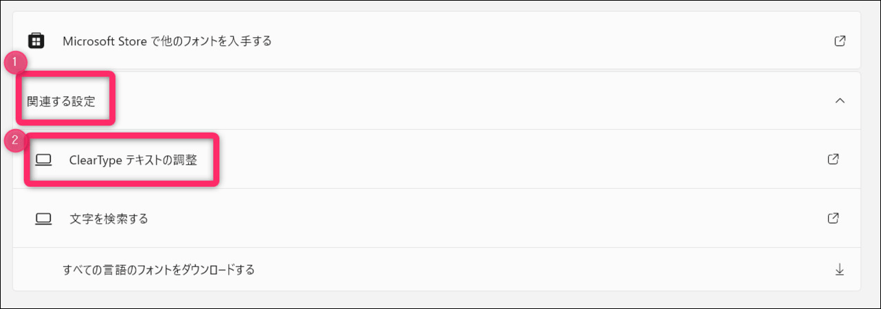 続いて「関連する設定」をクリックして下に展開される「ClearTypeテキストの調整」を選択します。