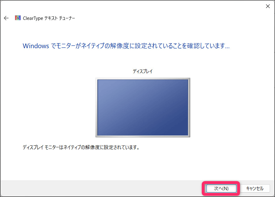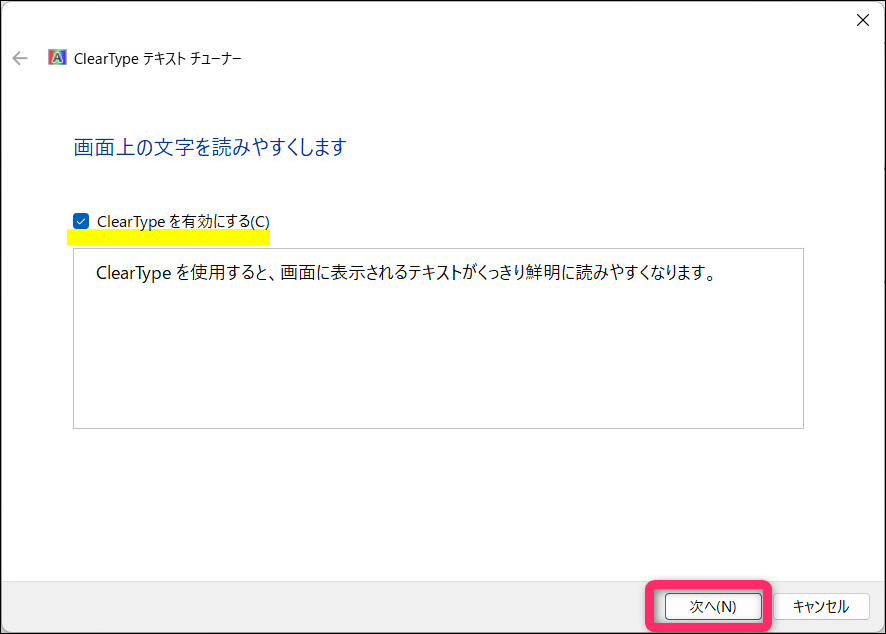 「ClearType テキスト チューナー」が起動したら「ClearType を有効にする」にチェックが入っていることを確認して「次へ」で進みます。(オン・オフを試して自分に合うか試せます)