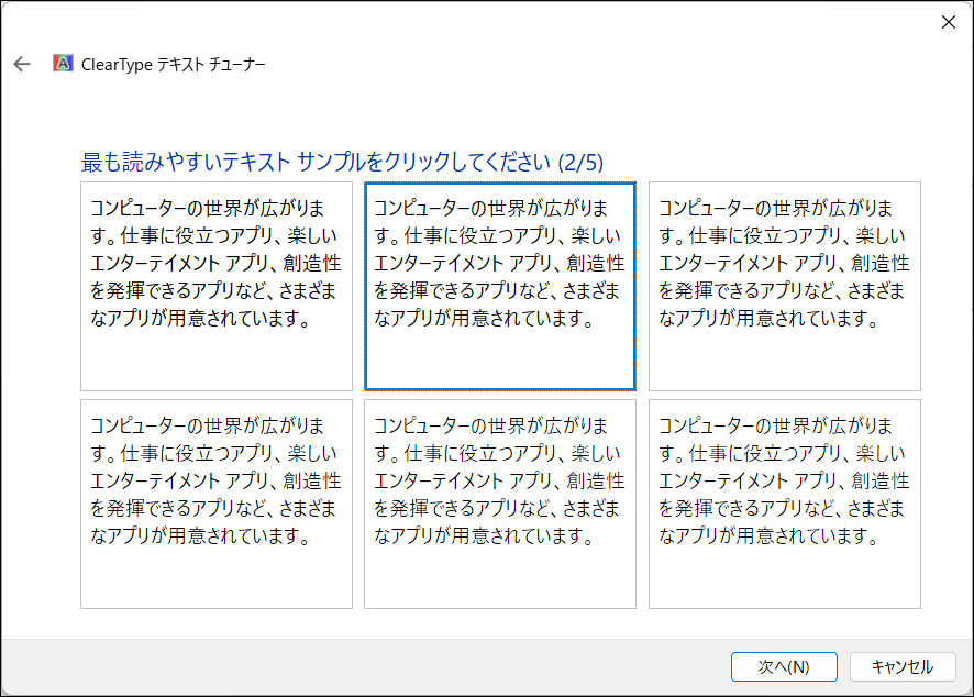 画面の指示に従って、自分にとって最も読みやすいテキストのサンプルを選択していきます。この作業を数回繰り返していくと、ディスプレイに最適なClearTypeの設定が完了します。