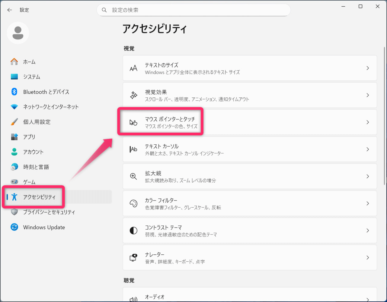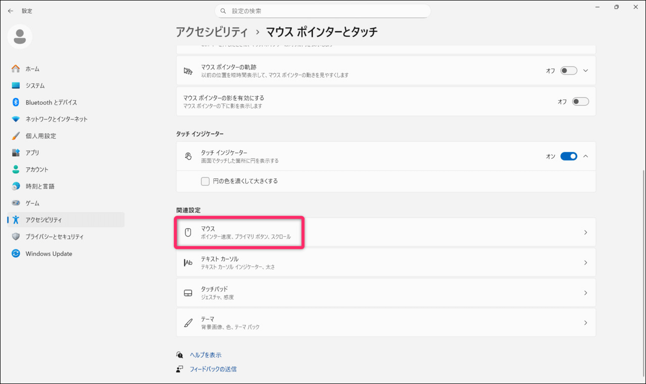 左側メニュー「アクセシビリティ」から「マウスポインターとタッチ」を選択します。