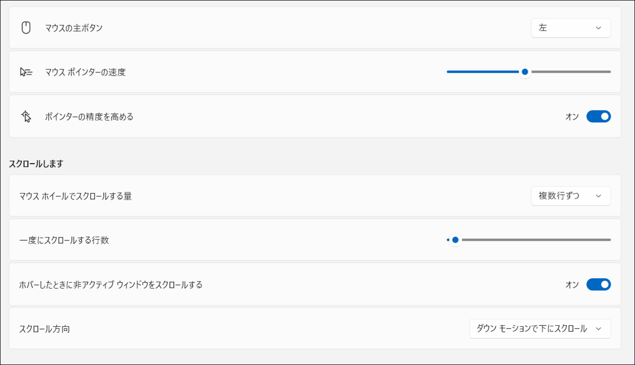マウスポインターの速度、一度にスクロールする行数など細かく調整できます。