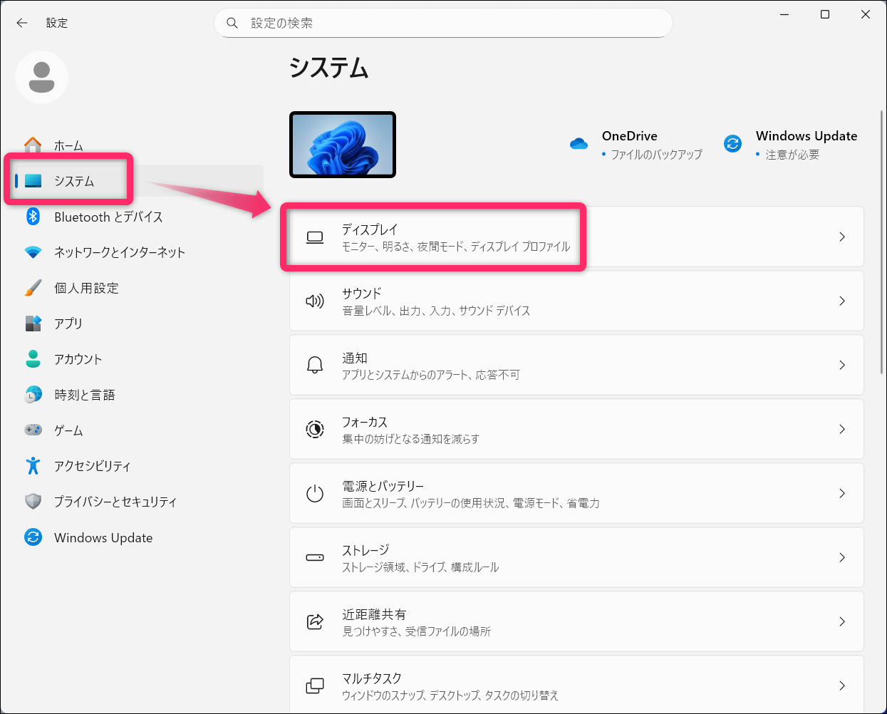画面左の「システム」から「ディスプレイ」へと進めます。
