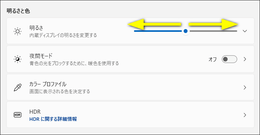 「明るさ」のスライダーを左右に動かして調整します 。