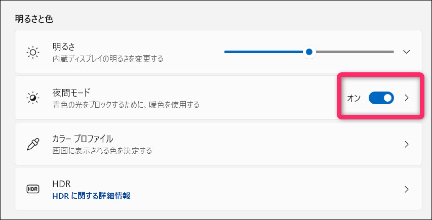 私のパソコンは明るさを調整しても画面が青っぽくて目が疲れるので、そういう時は「夜間モード」を活用します。