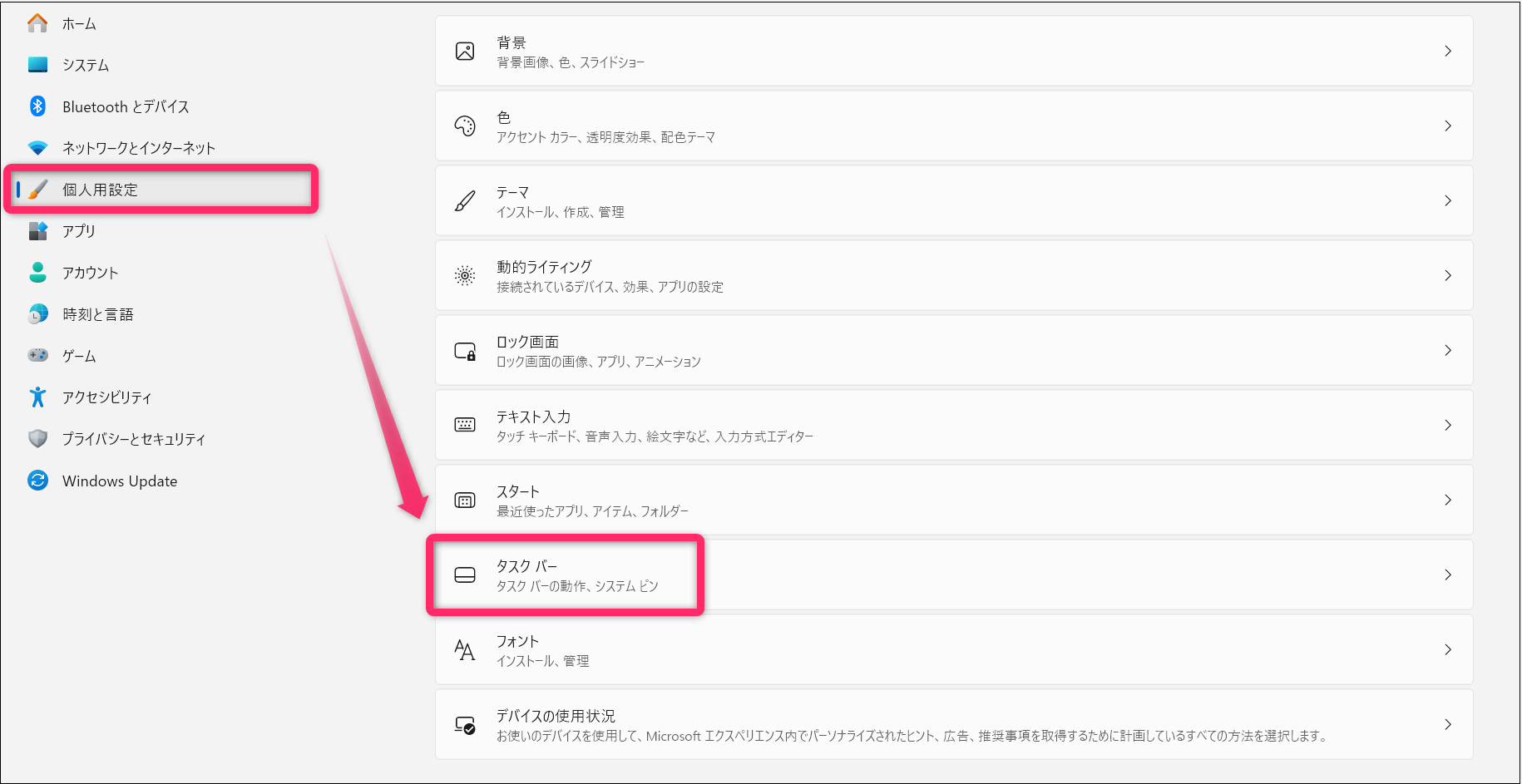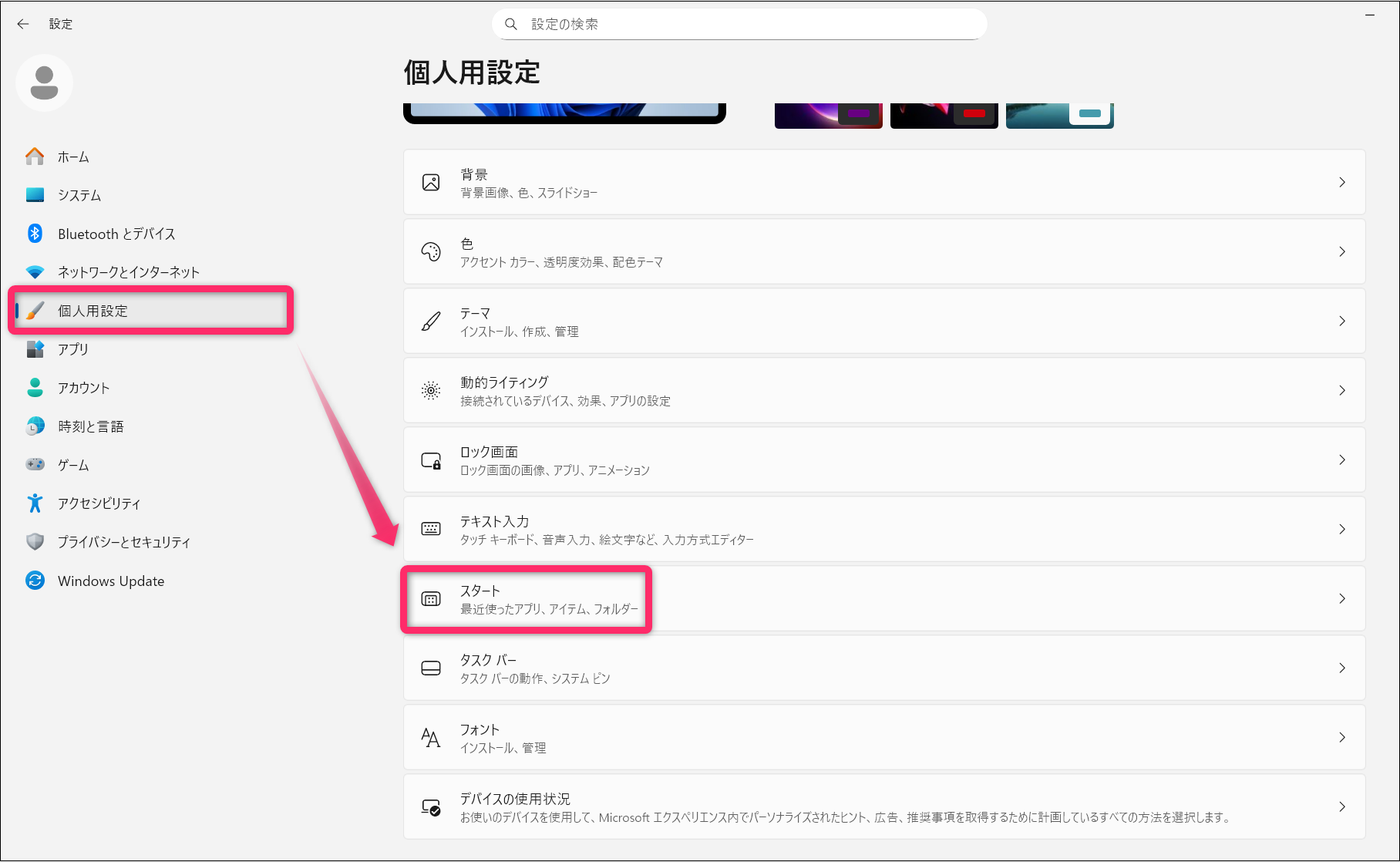 続いて左メニューの「個人用設定」から「スタート」を選択します。