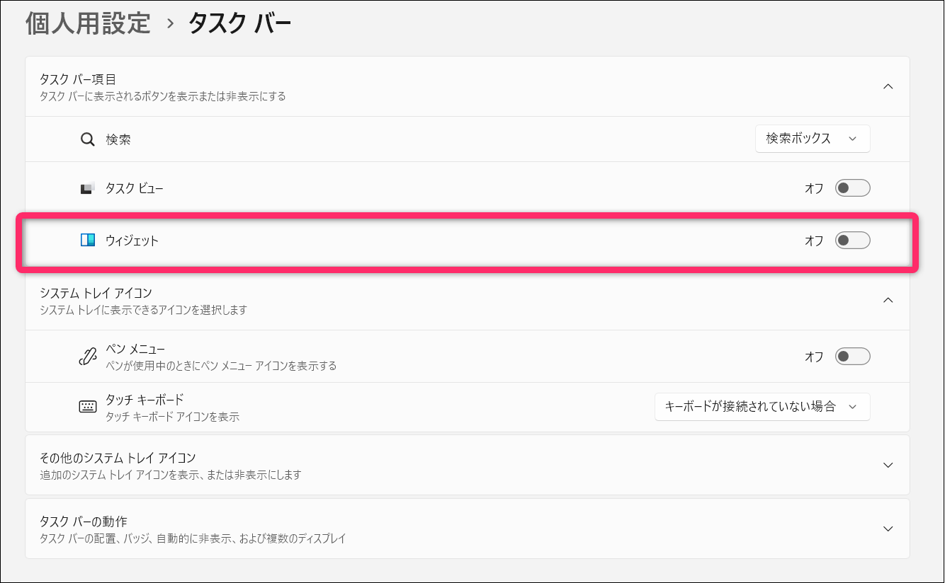 初期設定ではウィジェット」が左下に表示されていますが、こちらもオフにしておきます。