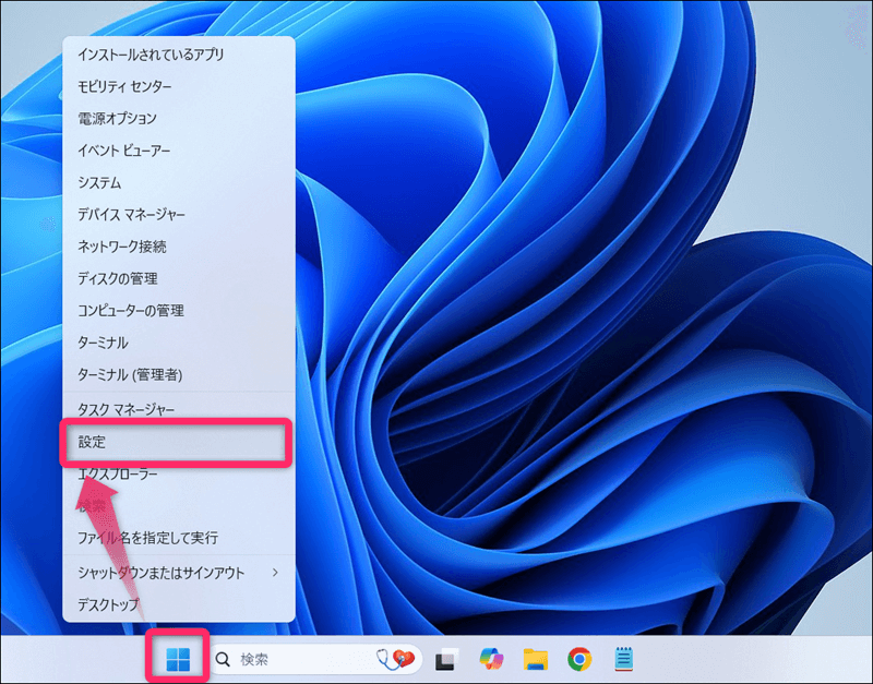 スタートボタンから「設定」を選択します。