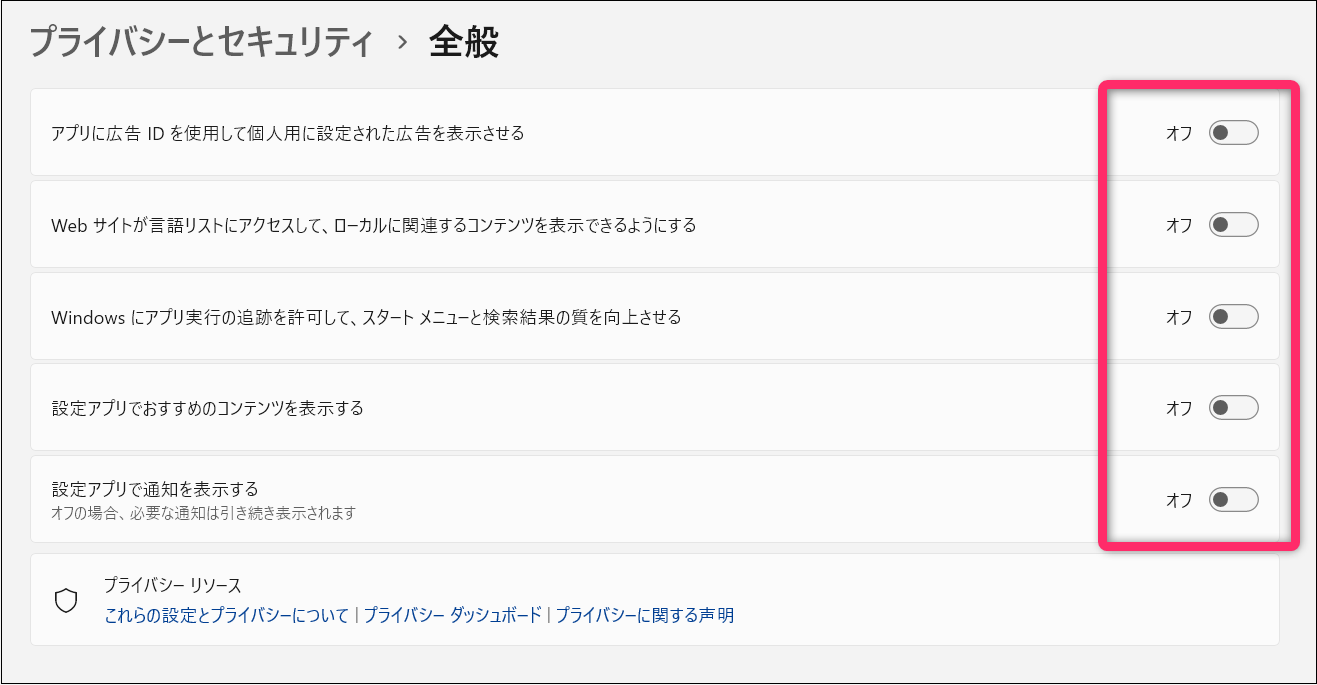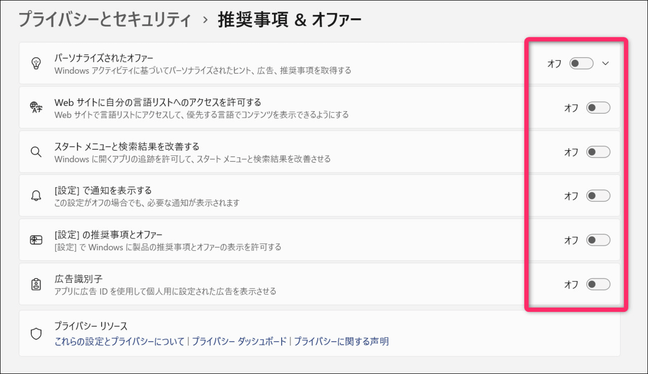 オフにすることでユーザーの利用状況をもとにした広告やヒントを表示してこないようにします。不要な通知や広告を減らせるので、より集中してPCを使用できるようにもなります。