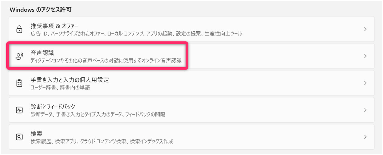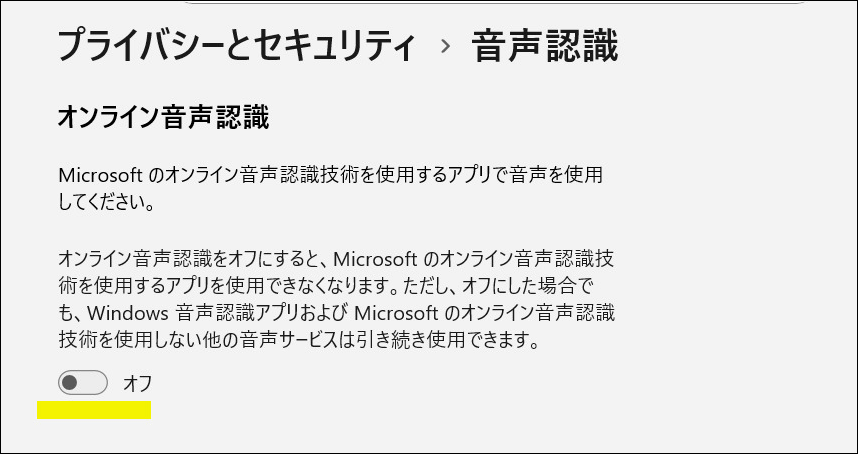 この機能が有効になっていると、Microsoftは音声認識の精度向上を目的として、ユーザーの音声データを収集し分析することがあります。特に不要なのでオフにしておきます。