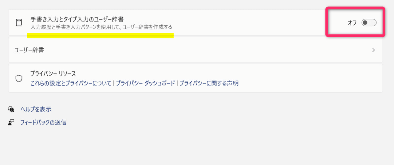 この機能がオンだと入力データがMicrosoftに送信され、個人用辞書や言語モデルの改善に利用されることがあります。