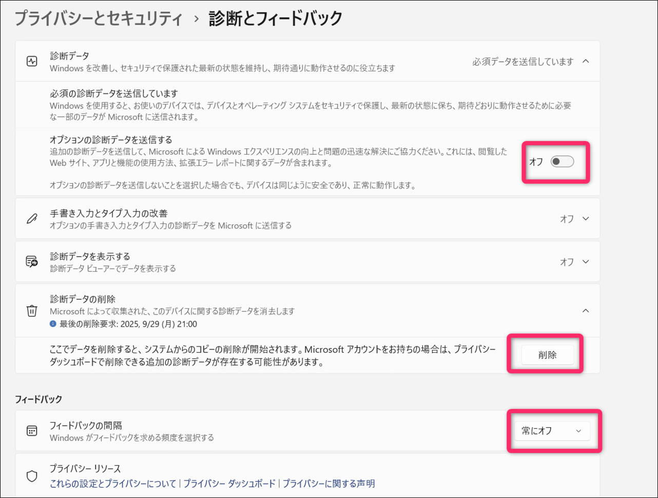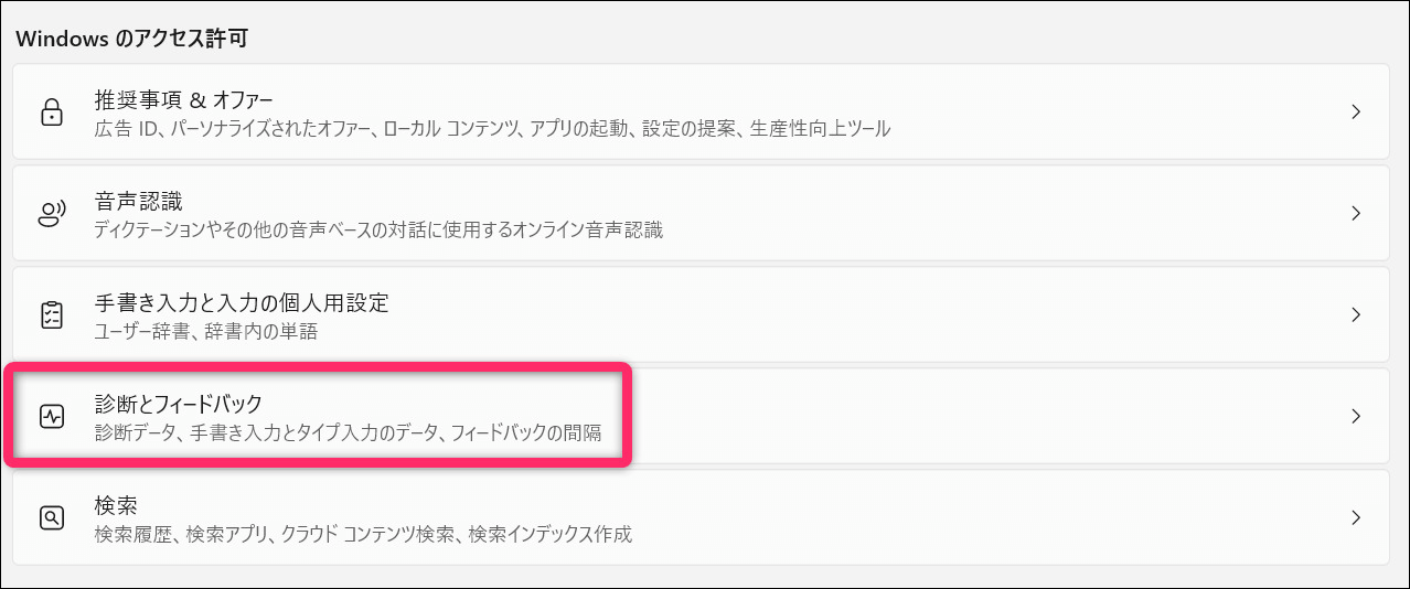 診断データには、デバイスの動作状況、エラー情報、使用状況などが含まれます。ユーザーの詳細なデバイス利用状況が含まれるのでオフにすることを推奨します。
