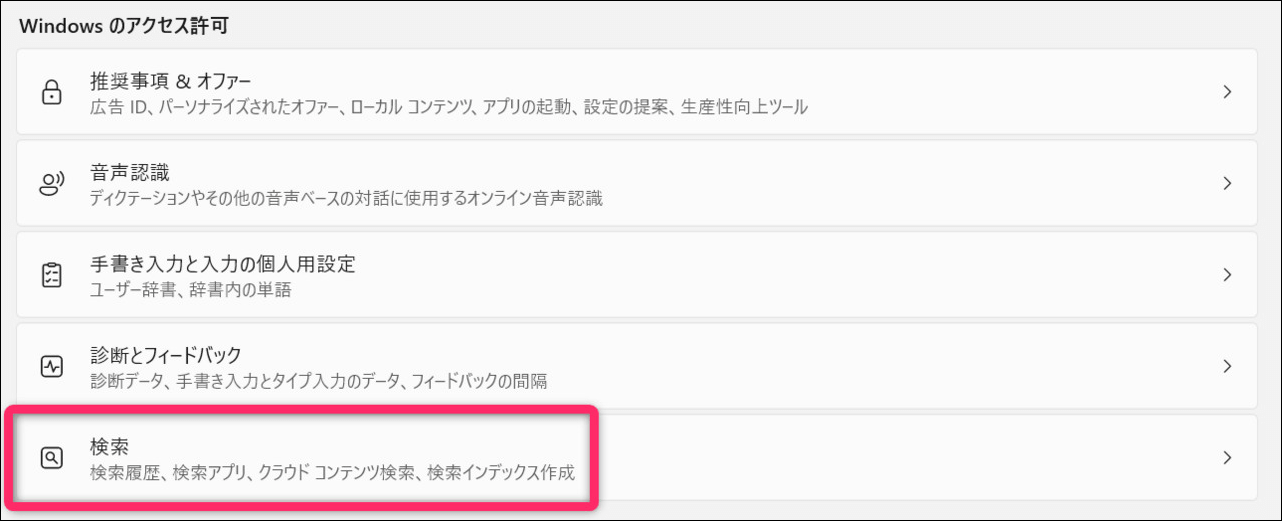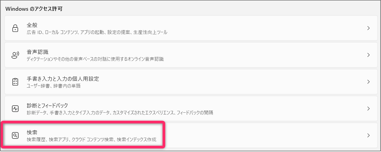 「プライバシーとセキュリティ」に戻って次は、「検索」の項目です。