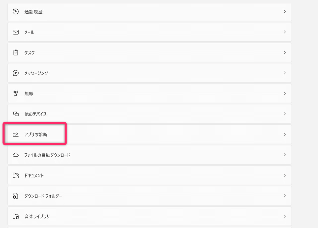 「プライバシーとセキュリティ」に戻って次は、下の方にある「アプリの診断」を選択します。