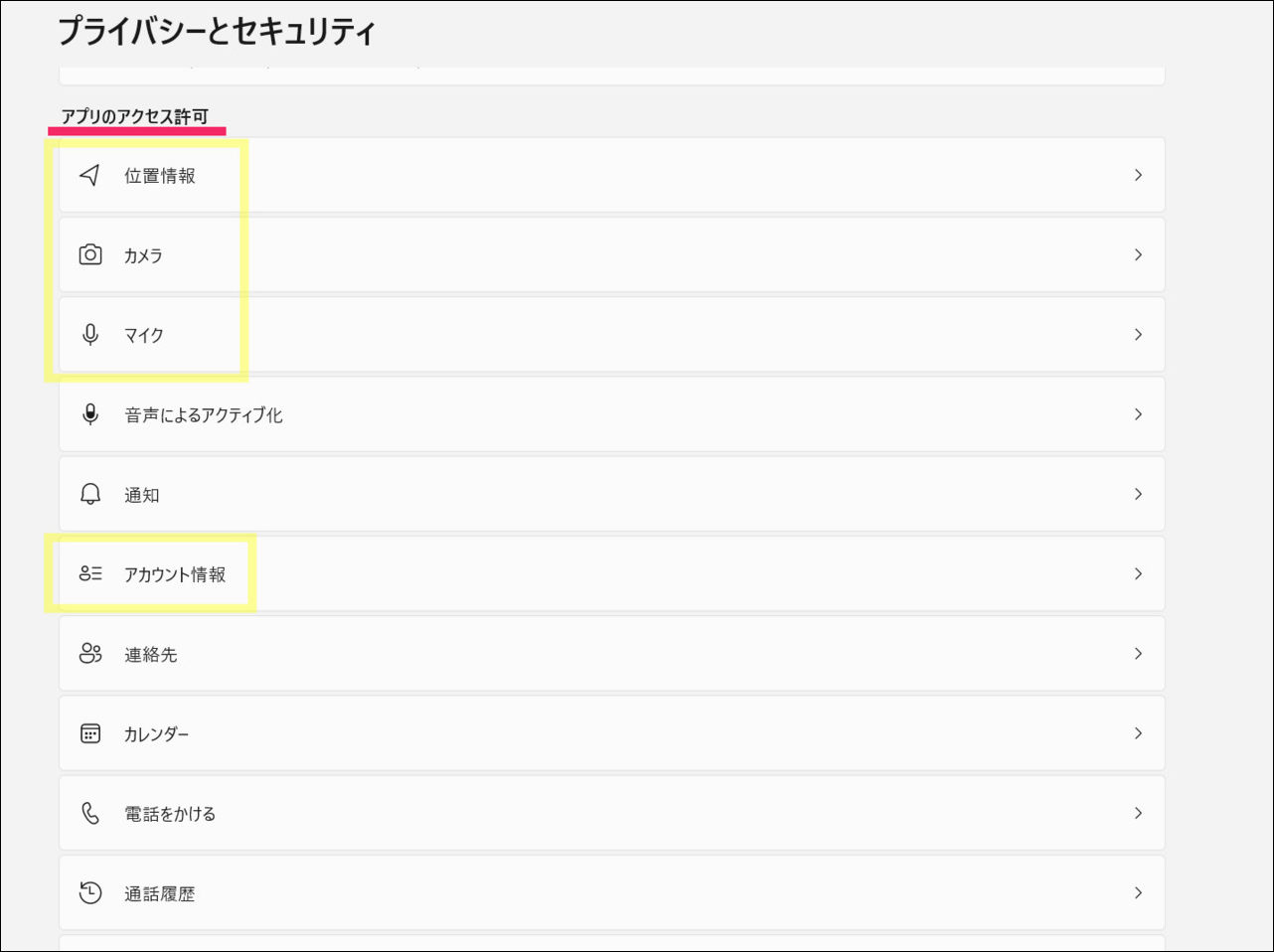 ほかにも「アプリのアクセス許可」で、位置情報・カメラ・マイクがどのアプリで許可されているかチェックしておくのをおすすめします。