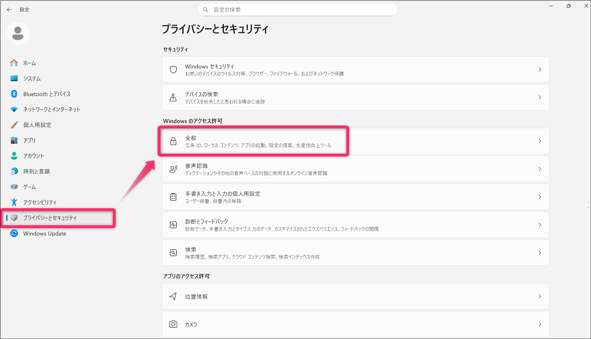 左側のメニュー「プライバシーとセキュリティ」を選択してから「全般」へと進みます。