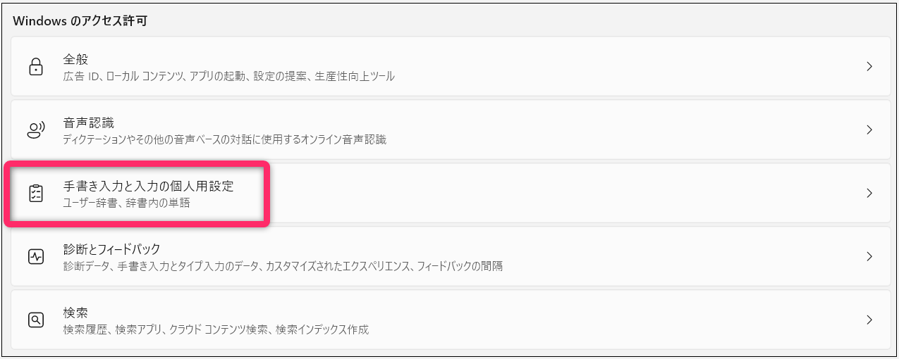 「プライバシーとセキュリティ」に戻って、次は「手書き入力と入力の個人用設定」です。