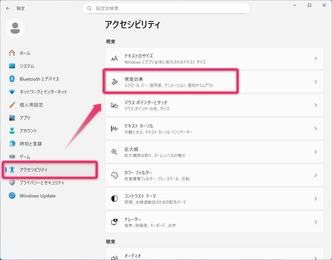 Windows 11 を買ってきたばかりの初期設定では、ファイルや画面がふわっと開くようなアニメーションや透明効果のような「視覚効果」が使われています。