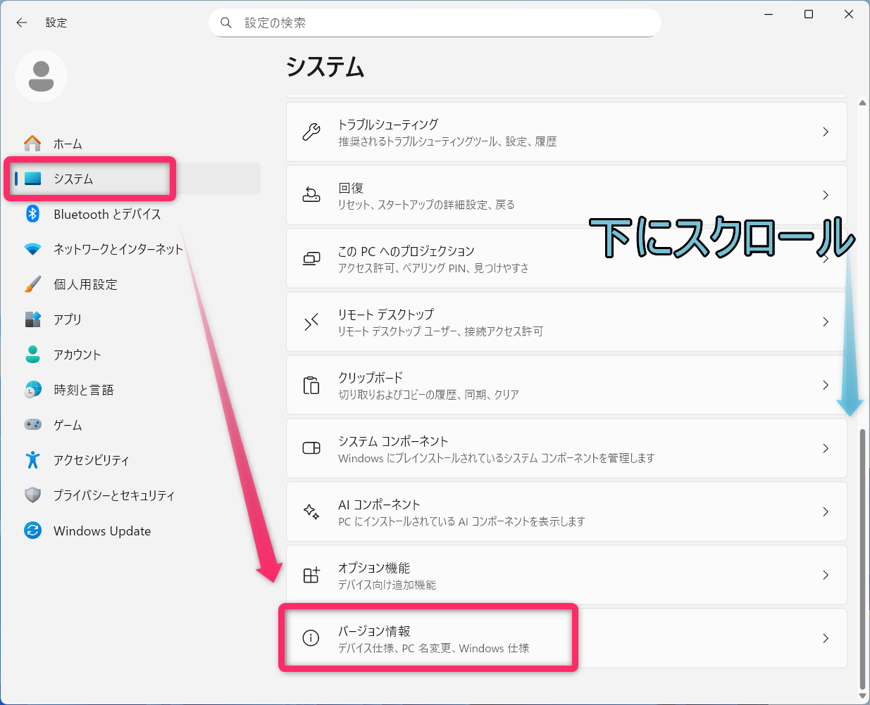 左側メニューの「システム」を選択し、下の方にある「バージョン情報」に進みます。