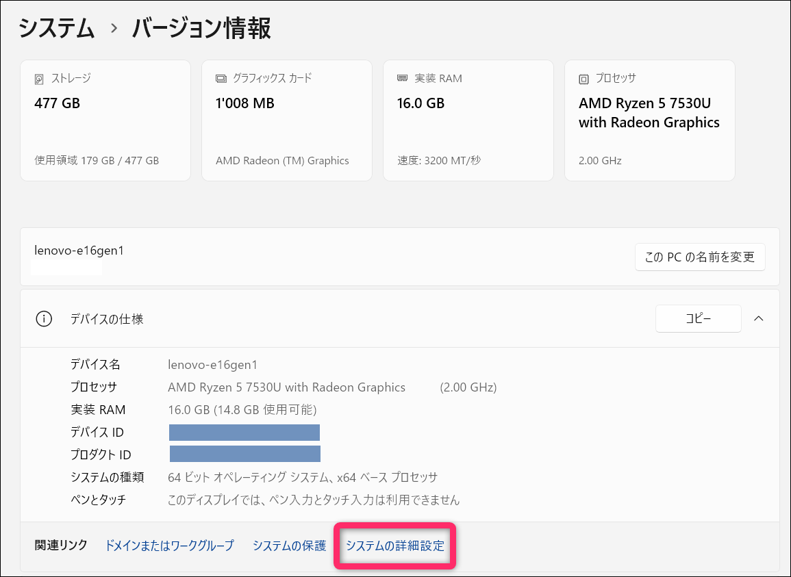 バージョン情報の下にある「システムの詳細設定」をクリックします。